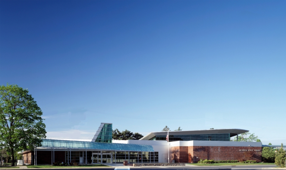 BETHPAGE PUBLIC LIBRARY, BETHPAGE NY - The Bethpage Public Library consists of an addition to and renovation of the existing library building. The interior of the existing building was entirely reorganized to include the staff areas, children’s library and media room. The addition includes a gallery space, auditorium for 240 people, stacks for the adult book collection, and light filled reading areas for seniors and young adults. A new enclosed garden allows the reading areas to extend beyond the interior of the building while also providing an outdoor reception area for the auditorium.