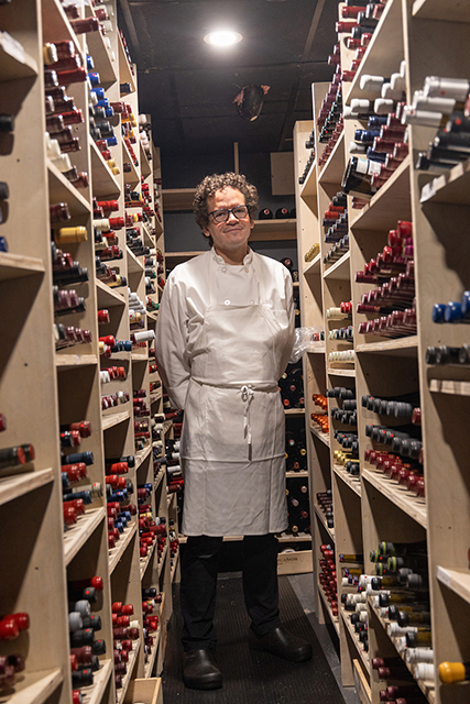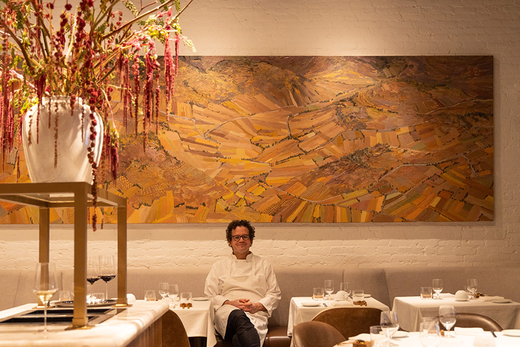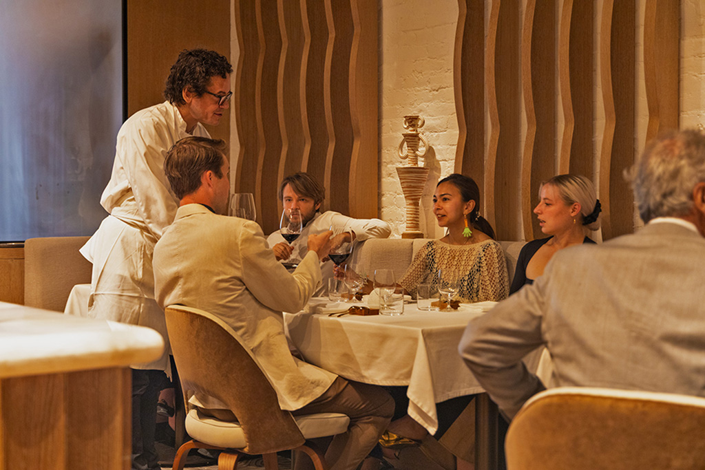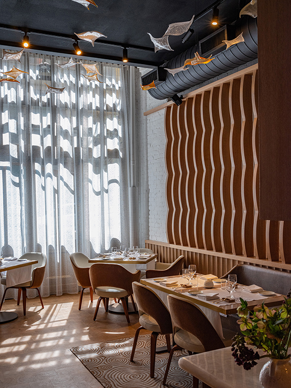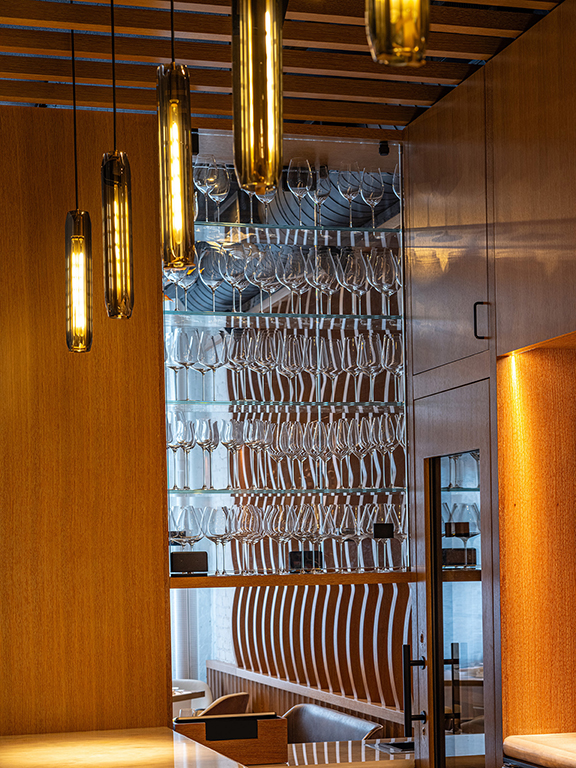Saint Urban, the namesake of this new restaurant, symbolizes a person and a culture. As the patron saint of vineyards, vintners, coopers and wine, he is called upon to protect a place, the work which is done there, its product and its custodians. The design reflects that heritage in forms, materials and colors we associate with the culture of that place. You see this in the earthen gray of the stucco walls, the naturally finished oak, blackened steel and brass, the gray, green and brown bottle tones of the light fixtures and hanging sculpture, the warm tans and browns of the fabrics and leathers. The artwork clarifies this association with place and terroir through the figural representation at large scale in maps and at a finer scale in the vines and roots themselves. The anthropomorphic features of the terracotta amphorae bring this culture reference of place and people into sculptural form. As a metaphorical reference, the profiles of the slatted wood louvers against the uplit masonry walls recall the twisted shapes of vine trunks as they rise from the earth to a trellis supporting the canes, shoots and fruit. The trellis form appears at the ceiling of the bar whose association with the vineyard is reinforced by the glowing glass leaves of the sculpture overhead set against a black background recalling the nighttime sky above an open field. Underfoot, textural variety continues in the solidity of the end grain wood floor to the softness of carpet to the hardness of slate-colored tile as though walking in the out-of-doors. The design of the tabletop similarly presents a composition of materials and colors – in wood, metal, glass and fabric - which pair with the offerings on the plate. Throughout, the textures and colors of natural materials are pre-eminent referencing the materiality of the dining experience and harmonizing with the product of the adjacent kitchen, modestly visible through its portal, as well as the precious contents of Saint Urban’s cellar.